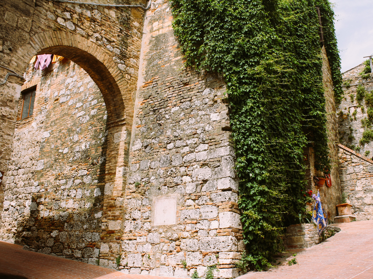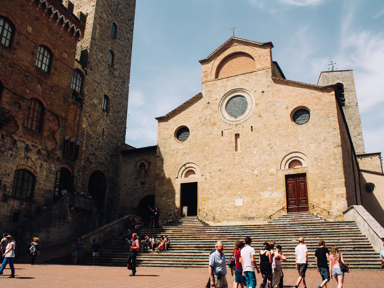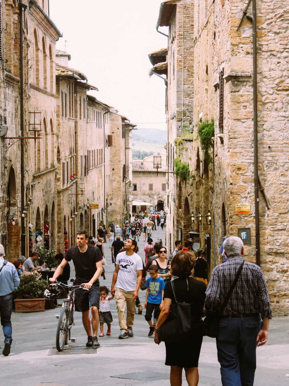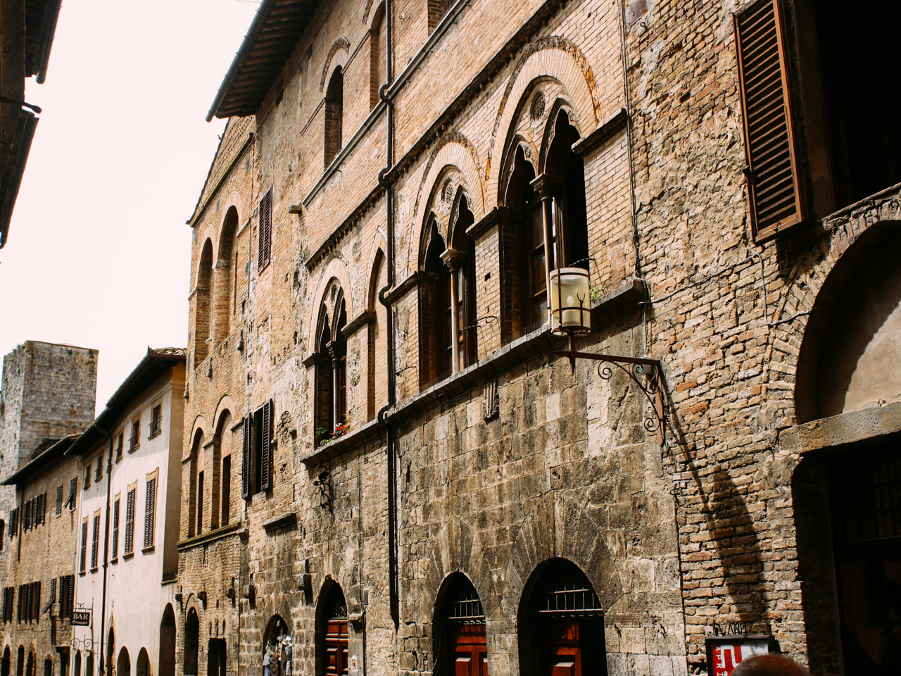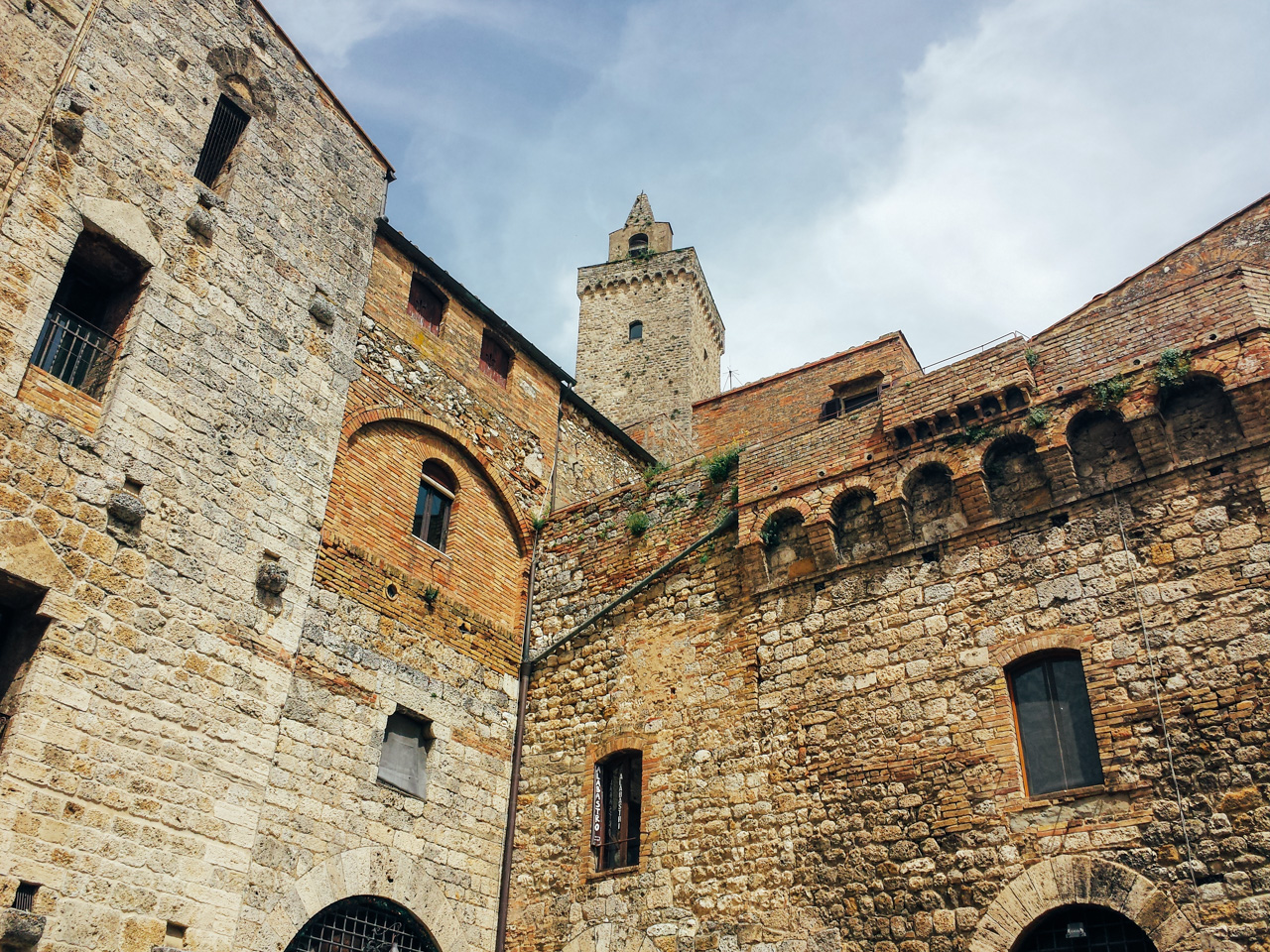 Na parte interna de San Gimignano é tudo espetacular. Os edifícios se mantém muito bem conservados e a estrutura como um todo parece que parou no tempo. O local é tido como uma jóia arquitetônica da era medieval. Embora hoje só existam 14 torres na cidade, no seu auge já contou com 72 torres construídas pelas famílias da época. As torres eram uma forma de manter o status das famílias, pois quem tinha a maior torre possuía maior respeito.